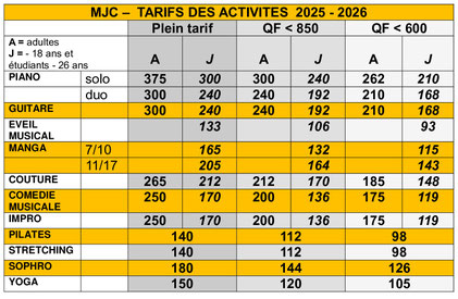 Les tarifs des activités sont présentés avec chaque activité et basés sur 30 séances de cours minimum pendant l'année scolaire.